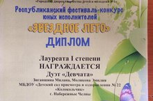 В июне на базе ГДТД и М № 1 прошел республиканский фестиваль- конкурс юных исполнителей "Звездное лето" . Воспитанницы музыкального руководителя Михайловой С.Ю. Зиганшина Милана, Молякова Эмилия награждены Дипломом Лауреата 1 степени в номинации "Вокал- дуэт". Поздравляем и желаем дальнейших творческих успехов.