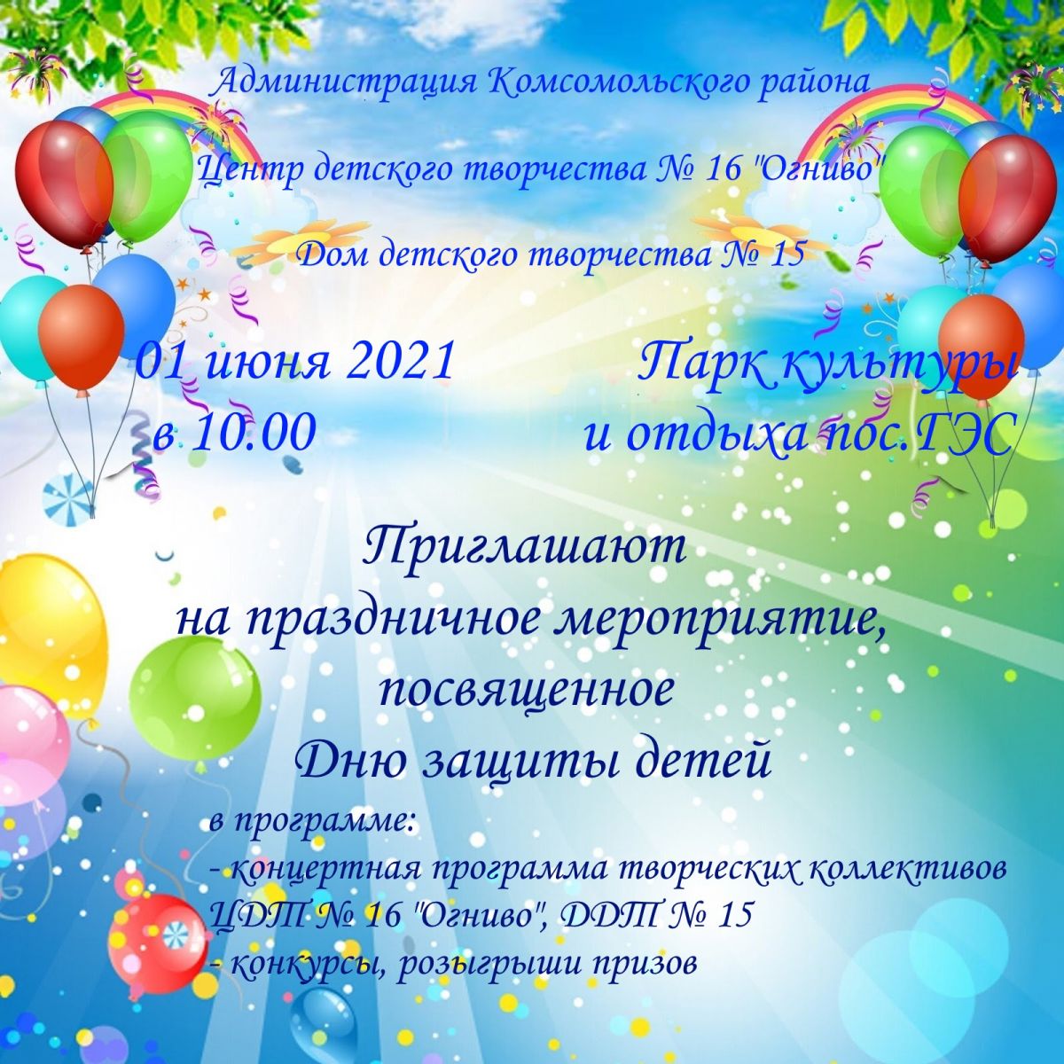 Администрация Комсомольского района г. Набережные Челны приглашает всех детей и их родителей на празднование Международного Дня защиты детей, который состоится 1 июня 2021 годв в 10.00 в Парке культуры и отдыха п. ГЭС.