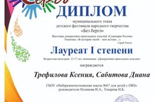 Поздравляем победителей Муниципального этапа детского фестиваля народного творчества "Без Берге" Диплом 1 степени в номинации "Декоративно-прикладных изделий"Сувениры России". Тематика "В истории твоей- мои истоки ..."