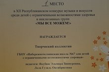 ГБОУ "Набережночелнинская школа № 7" приняла участие и заняла 1 место в XII Республиканском конкурсе музыки и искусства среди детей с ограниченными возможностями здоровья и инклюзивных групп "Мы все можем!"