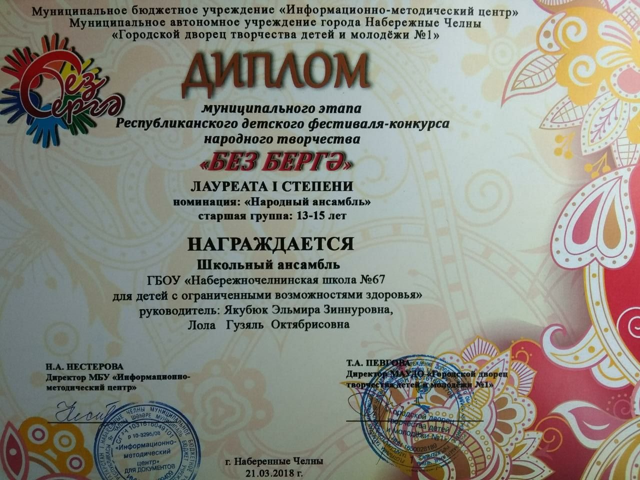 Школьный ансамбль ГБОУ "Набережночелнинская школа №67" лауреат 1 степени муниципального этапа республиканского детского фестиваля-конкурса народного творчества "Без бергә" в номинации "Народный ансамбль".