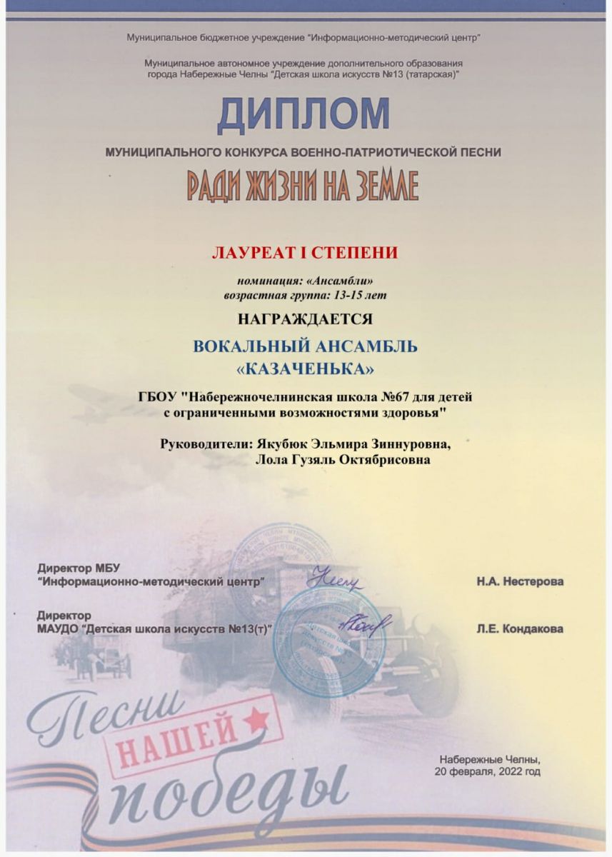 Опубликовано: 17.03.202217.03.2022 г. вокальный ансамбль " Казаченька" ГБОУ "Набережночелнинская школа № 67" стал лауреатом 1 степени за участие в конкурсе военно- патриотической песни " Ради жизни на Земле" фото
