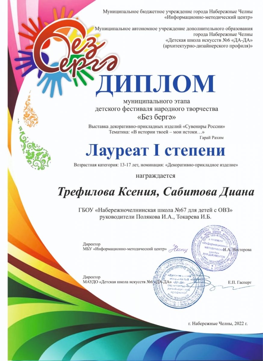 Опубликовано: 05.05.2022Поздравляем победителей Муниципального этапа детского фестиваля народного творчества "Без Берге" Диплом 1 степени в номинации "Декоративно-прикладных изделий "Сувениры России". Тематика "В истории твоей- мои истоки ..."