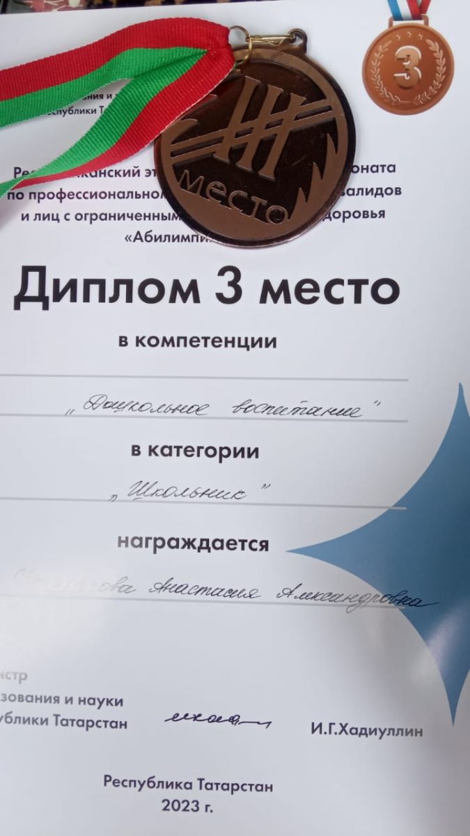Поздравляем Калмыкову Анастасию с победой в конкурсе Абилимпикс по компетенции "Дошкольное воспитание" 3 место!