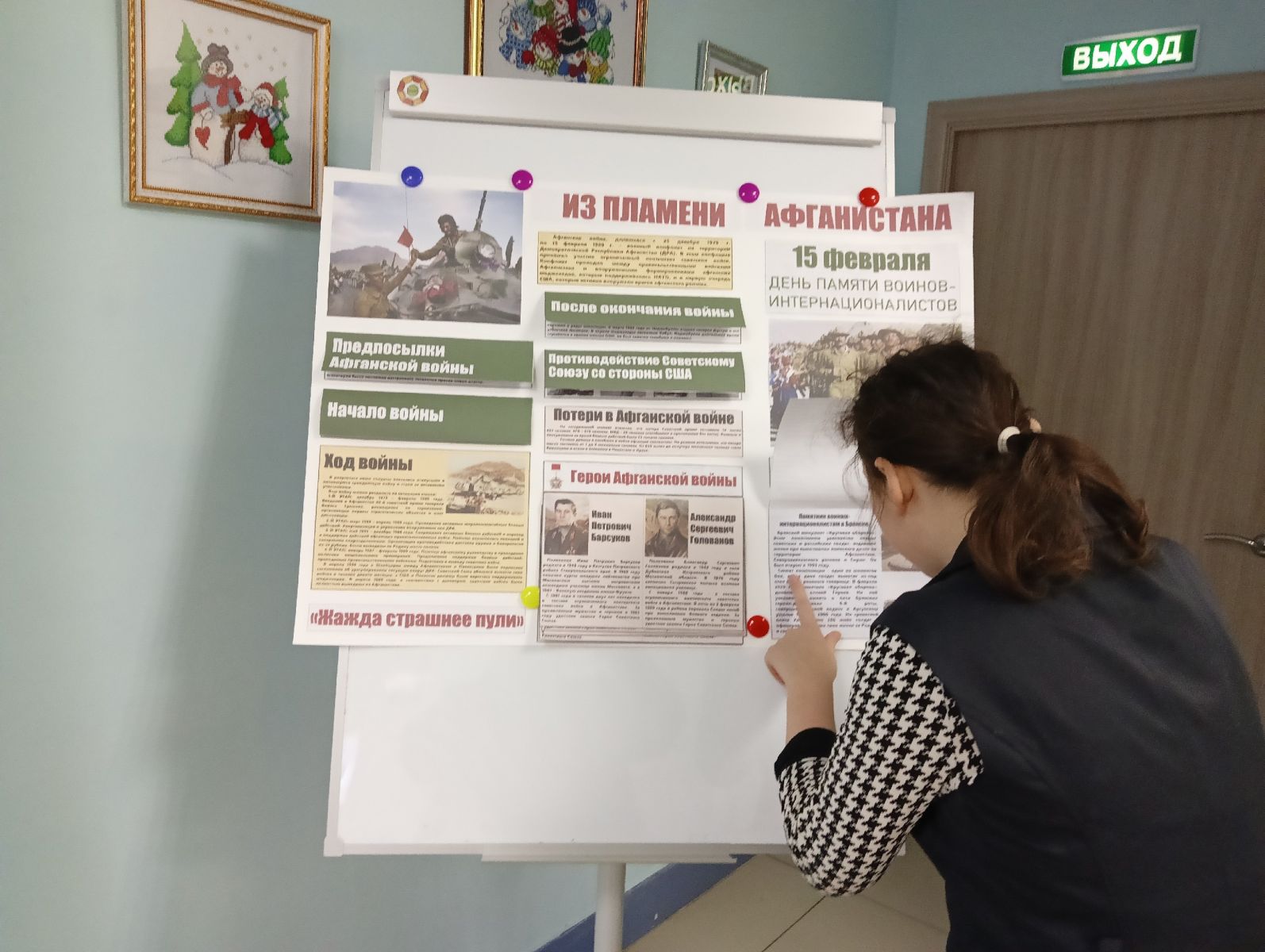 Обучающимися старших классов, совместно с библиотекарем Ольгой Николаевной Кудимовой, была подготовлена стенгазета "Из пламени Афганистана". Готовя материал к стенгазете Елена Владимировна напомнила старшеклассникам, что 15 февраля вспоминают не только ветеранов войны