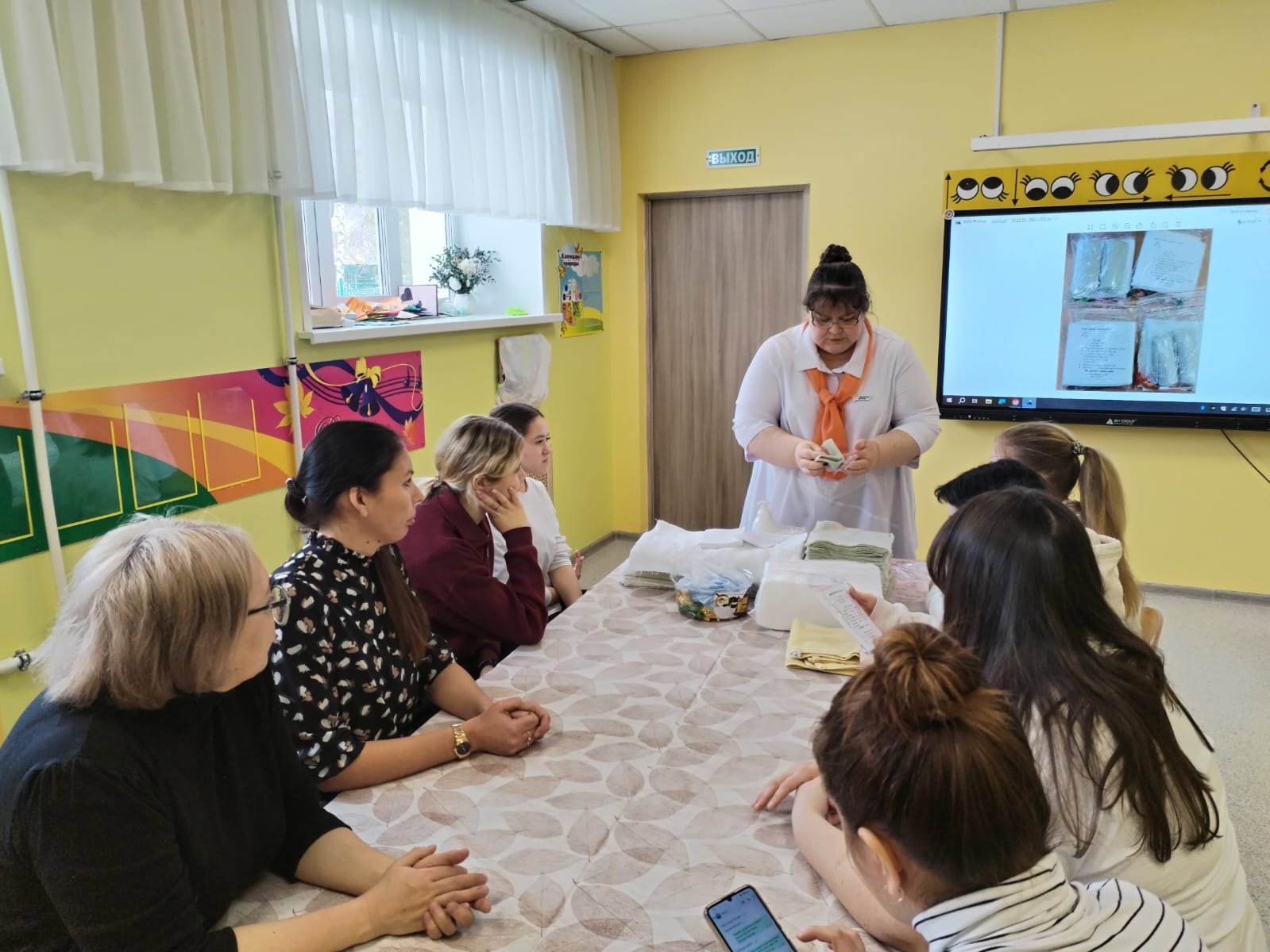 Советник директора по воспитанию Елена Владимировна Барламова продемонстрировала принцип работы душа, состав и технологию сбора. Женщины, со свойственной им усердием, отзывчивостью и интересом, включились в работу и собрали более 100 комплектов.