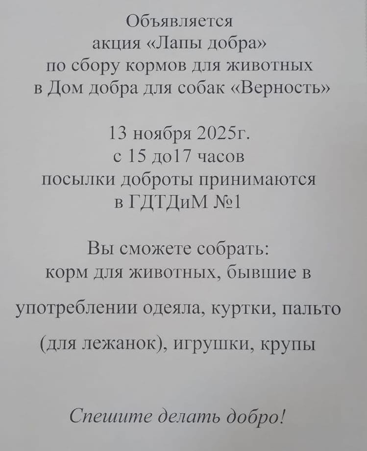 Опубликовано: 13.11.2025Тимуровский отряд "Непоседы "Набережночелнинской школы №67" принимает участие с городской благотворительной акции "Лапы добра" по сбору кормов для животных в Дом добра для собак "Верность"