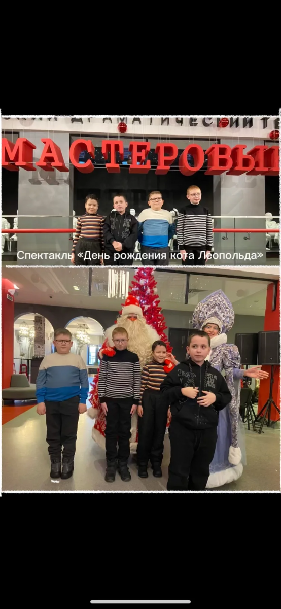 Опубликовано: 04.01.2026Учащиеся 5а, 5б, 9б классов посетили МАУК РДТ «Мастеровые». Для юных любителей театрального искусства было организовано новогоднее представление и просмотр спектакля «День рождения кота Леопольда».