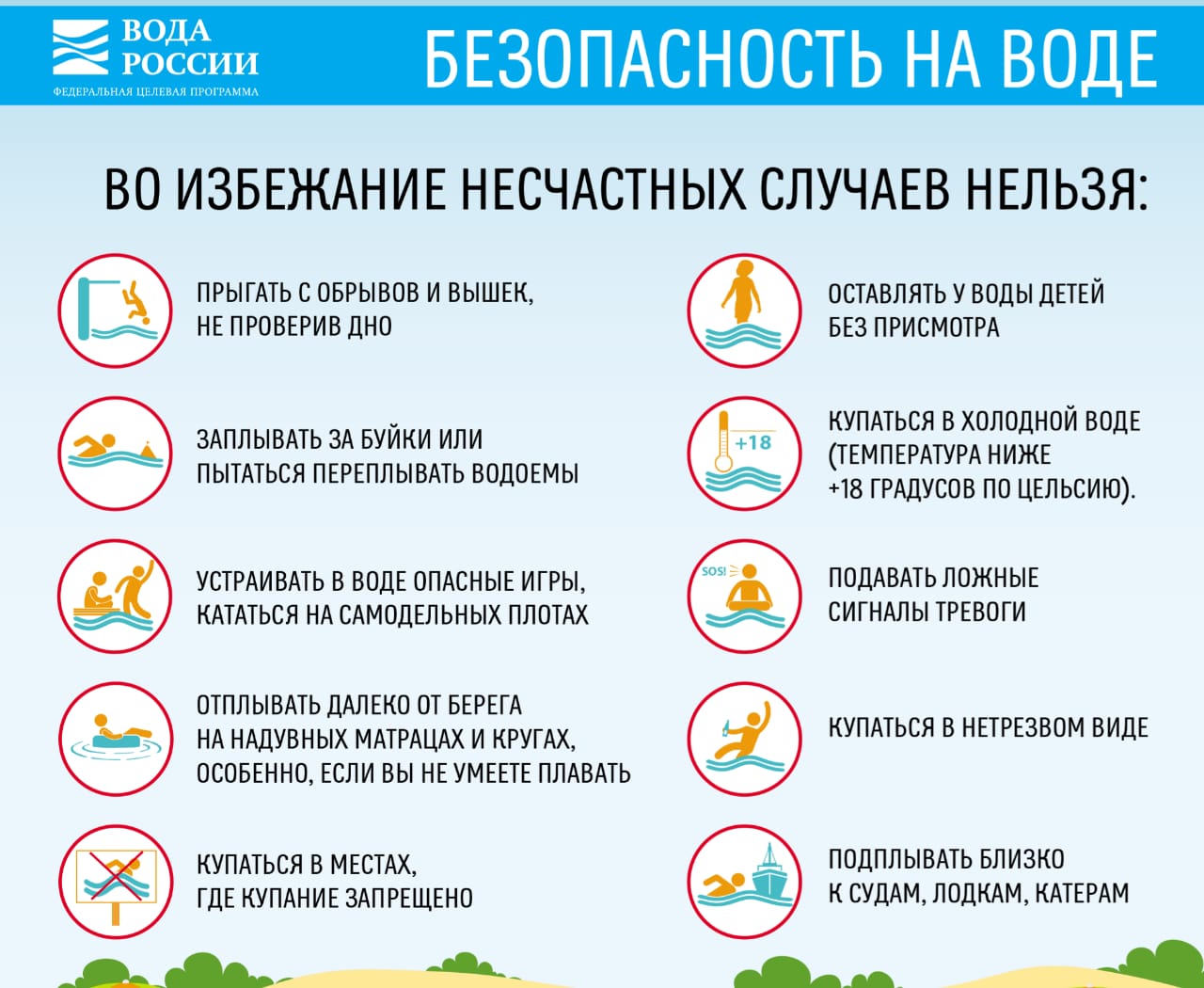 • Купание в необорудованных и запрещенных для купания водоемах;