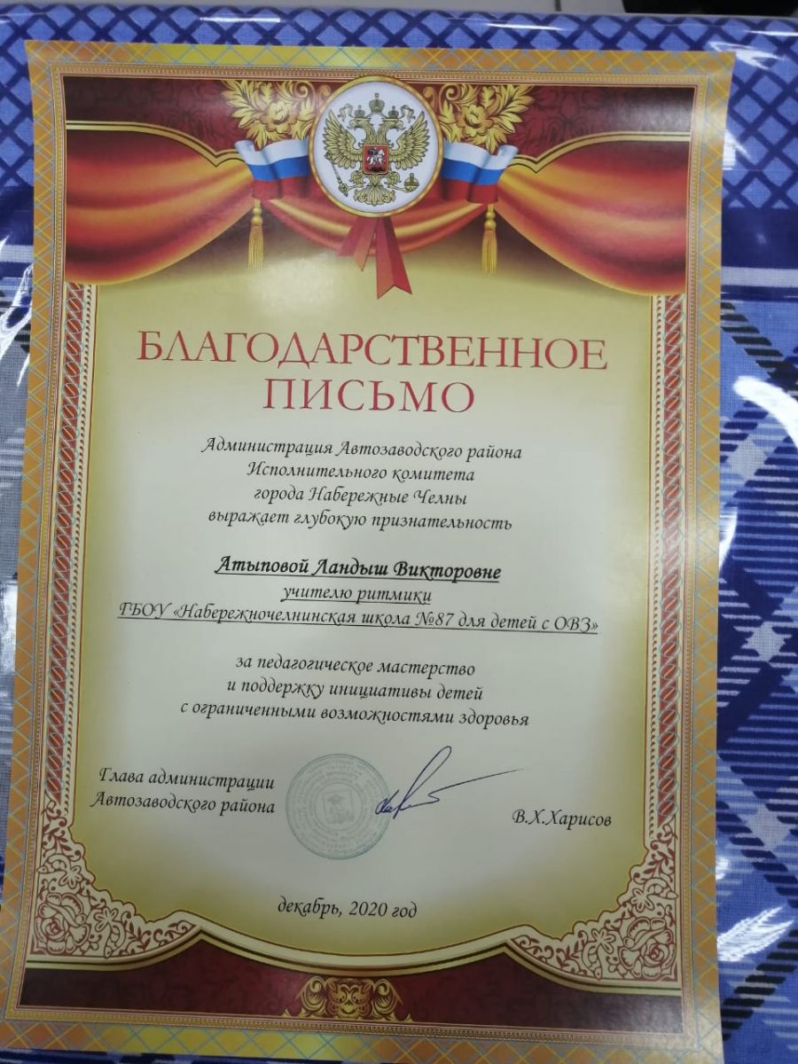 3 декабря 2020 года состоялось мероприятие по подведению итогов Декады инвалидов. учитель ритмики Атыпова Ландыш Викторовна была награждена грамотой за педагогическое мастерство и поддержку инициатвы детей с ОВЗ.