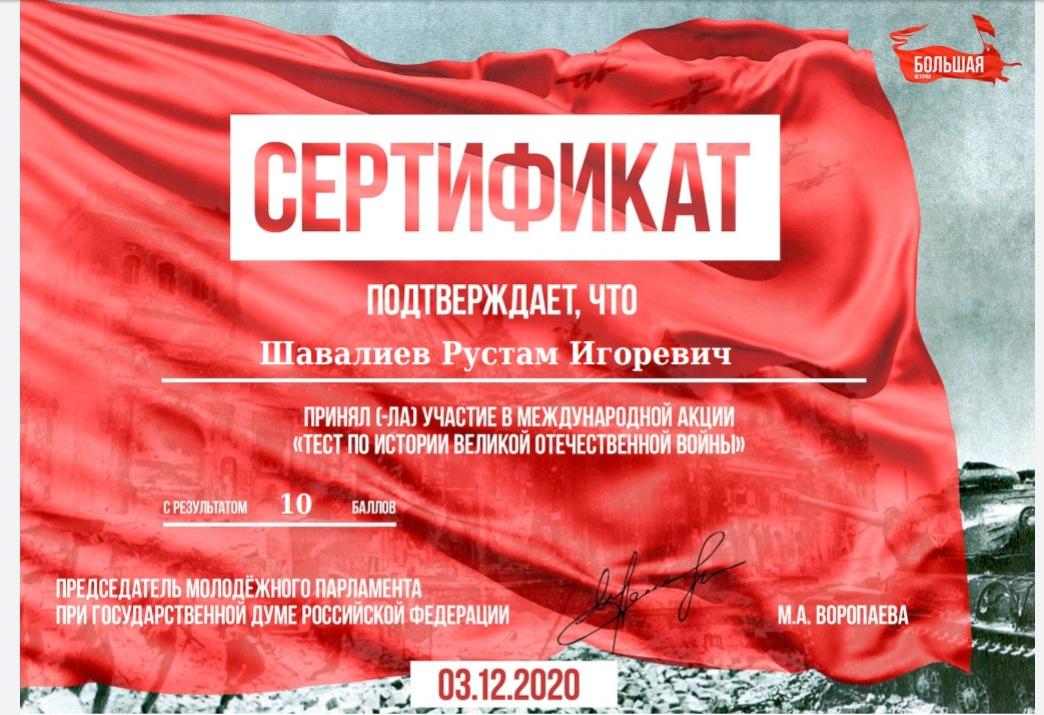 03 декабря 2020 года в День Неизвестного солдата в России в Набережночелнинской школе № 87 прошло тестирование учащихся 9-12 классов в рамках Международной акции «Тест по истории Великой Отечественной войны» (International action «History test of the victory over fascism») международного проекта «Большая история». Наша школа была зарегестрирована как площадка проведения данного тестирования. Учащиеся и педагоги приняли активное участие в данном опросе и получили памятные сертификаты. Неизгладимое впечатление произвел на участников просмотр видеофильма «Неизвестный Солдат» , подготовленный Молодежным парламентом при Государственной Думе.