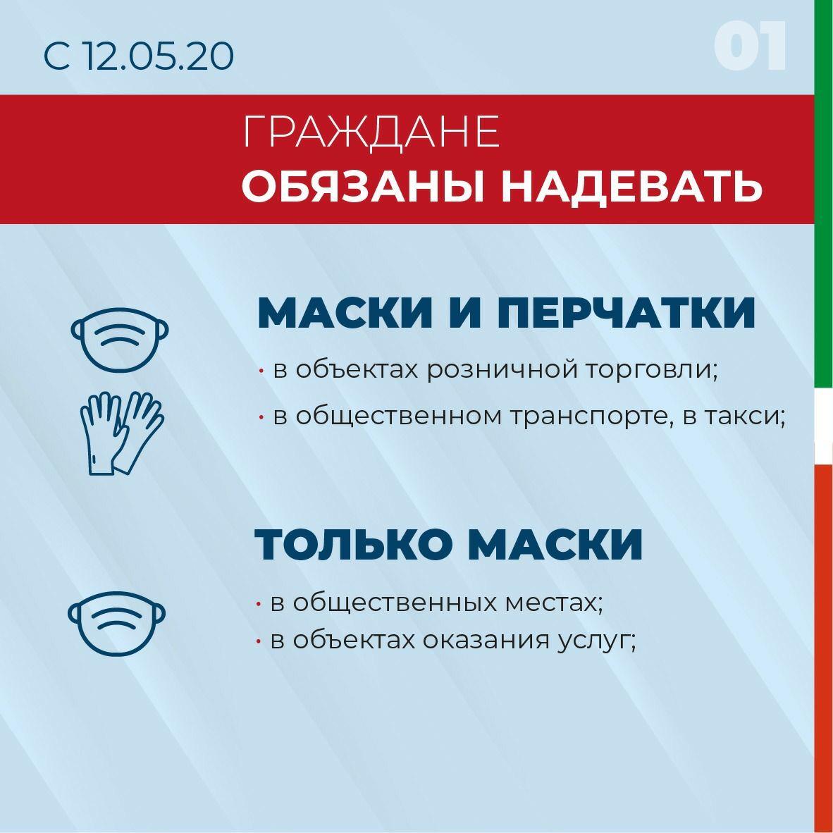 С 12 мая 2020 года рекомендуется соблюдать самоизоляцию, не покидать без необходимости место проживания и максимально ограничить контакты с другими людьми. На улице следует находиться в масках и перчатках.