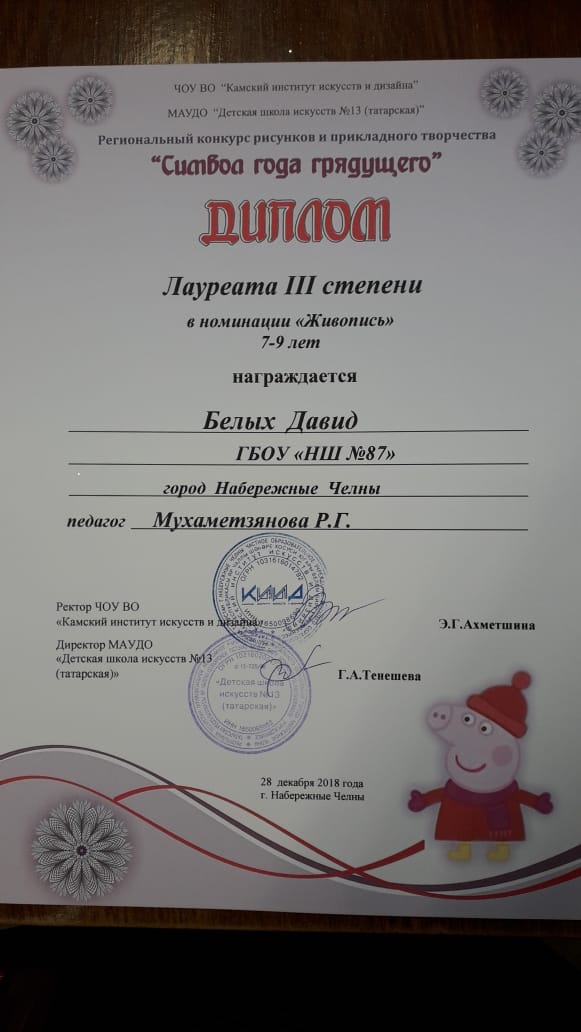Ученики 1 и 4 классов участвовали в региональном конкурсе рисунков и прикладного творчества "Символ года грядущего", где заняли 3 места. Поздравляем их!