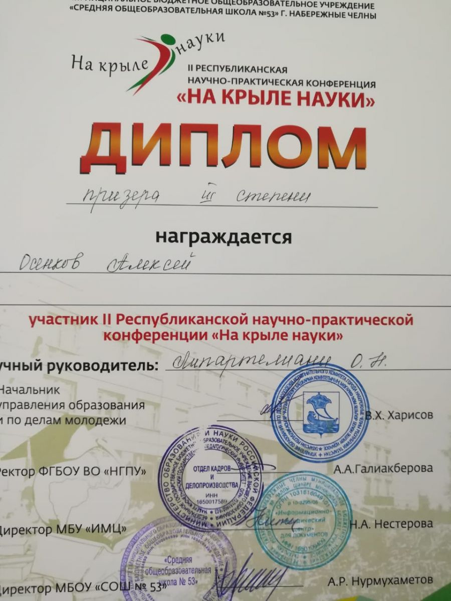 15 декабря ученик 9 класса Осенков Алексей участвовал во II Республиканской научно-практической конференции "На крыле науке" с темой "Роль княгини Ольги в формировании древнерусского государства" на секции "История, краевеедение". Среди всех учатсников наш ученик получил Диплом III степени. Поздравляем его.