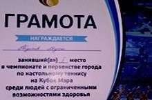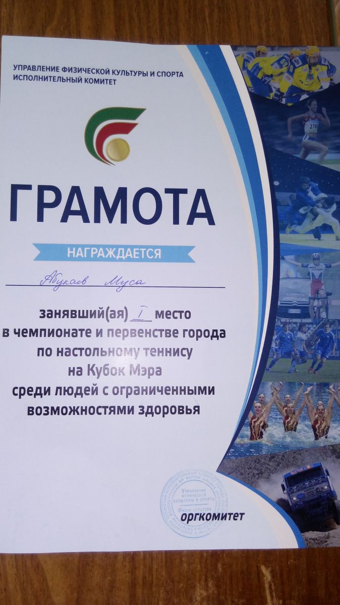 Ученик 9 класса Абукаев Муса занял 1 место в чемпионате и первенстве города по настольному теннису на Кубок Мэра среди людей с ограниченными возможностями здоровья.