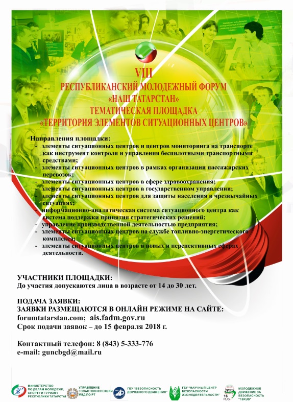 На основании письма ГБУ «Безопасность дорожного движения» № 71 от 26.01.2018 г. сообщаем Вам, что в рамках VIII Республиканского молодежного форума «Наш Татарстан» сформирована площадка «Территория элементов ситуационных центров».