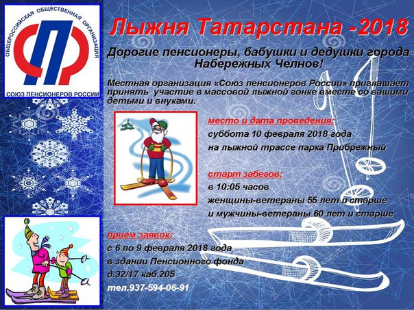 Дорогие пенсионеры, бабушки и дедушки города Набережных Челнов! Местная организация "Союз пенсионеров России" приглашает принять участие в массовой лыжной гонке вместе с вашими детьми и внуками.