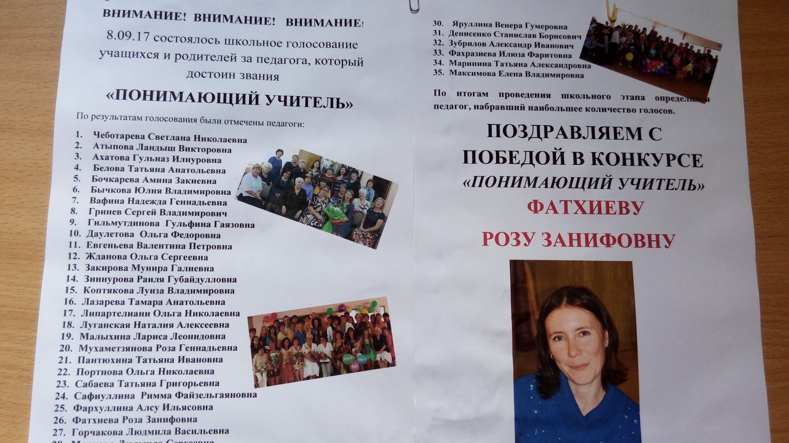 8 сентября состоялось школьное голосование учащихся и родителей за педагога, который достоин звания "Понимающий учитель". По результатам голосования победила Фатхиева Роза Занифовна (учитель английского языка). Поздравляем!