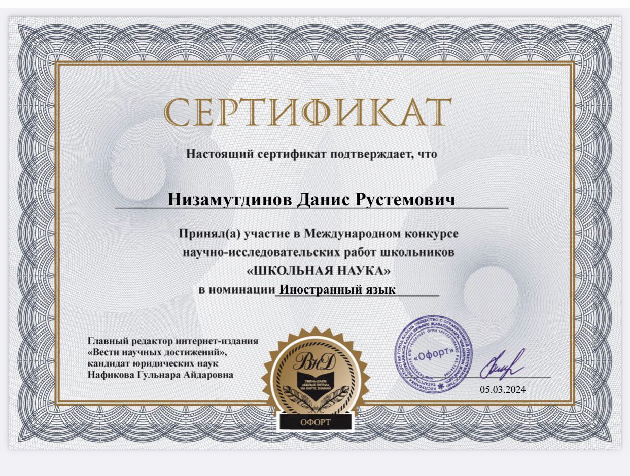 В марте учащиеся 9 класса Каплин Арсений и Низамутдинов Данис приняли участие в Международном конкурсе научно- исследовательских работ школьников старших классов «Школьная наука», организованном Республиканским олимпиадным центром Министерства образования и науки Республики Татарстан. Ребята успешно защитили проекты по сравнению английского и татарского языков.