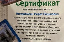 Рифат Нигматуллин, ученик 11 класса, прошел обучение по курсу "Универсальный мобильный помощник" (для незрячих и слабовидящих людей). Он успешно справился с заданиями отборочного этапа по Республике Татарстан и попал в финал конкурса. Финал VI всероссийского конкурса "Словом и жестом" состоялся 11 ноября в Нижнем Новгороде. VI всероссийский конкурс "Словом и жестом" организован в рамках проекта "Универсальный мобильный помощник", который реализуется Нижегородским областным центром реабилитации инвалидов по зрению "Камерата" в партнерстве с некоммерческими организациями из регионов России при поддержке ПАО "МегаФон".