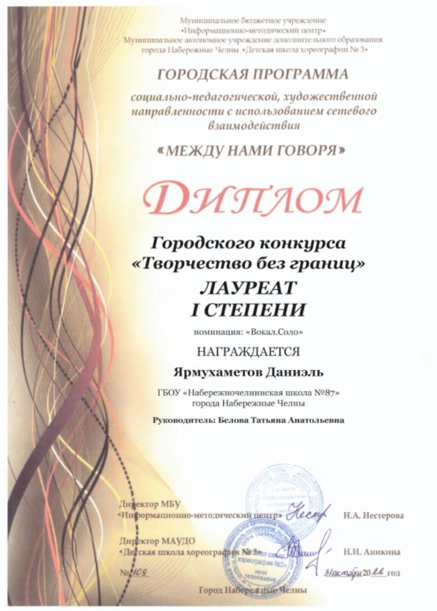 31.10.2022 года состоялся городской конкурс "Творчество без границ", где Ярмухаметов Даниэль, ученик 9 класса, занял 1 место, а танцевальный коллектив 4 класса- 2 место. Молодцы, поздравляем!