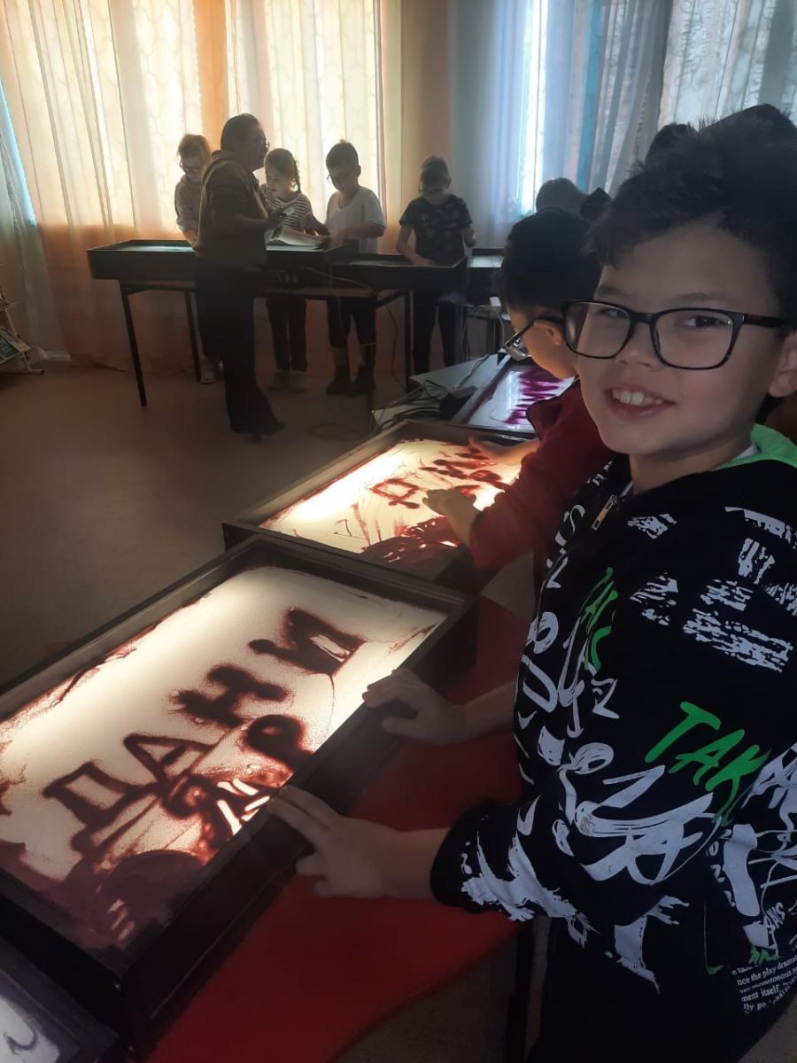 16.09.22 ребята 3 класса посетили городскую библиотеку 14, где поучаствовали в мастер-классе по песочной анимации.