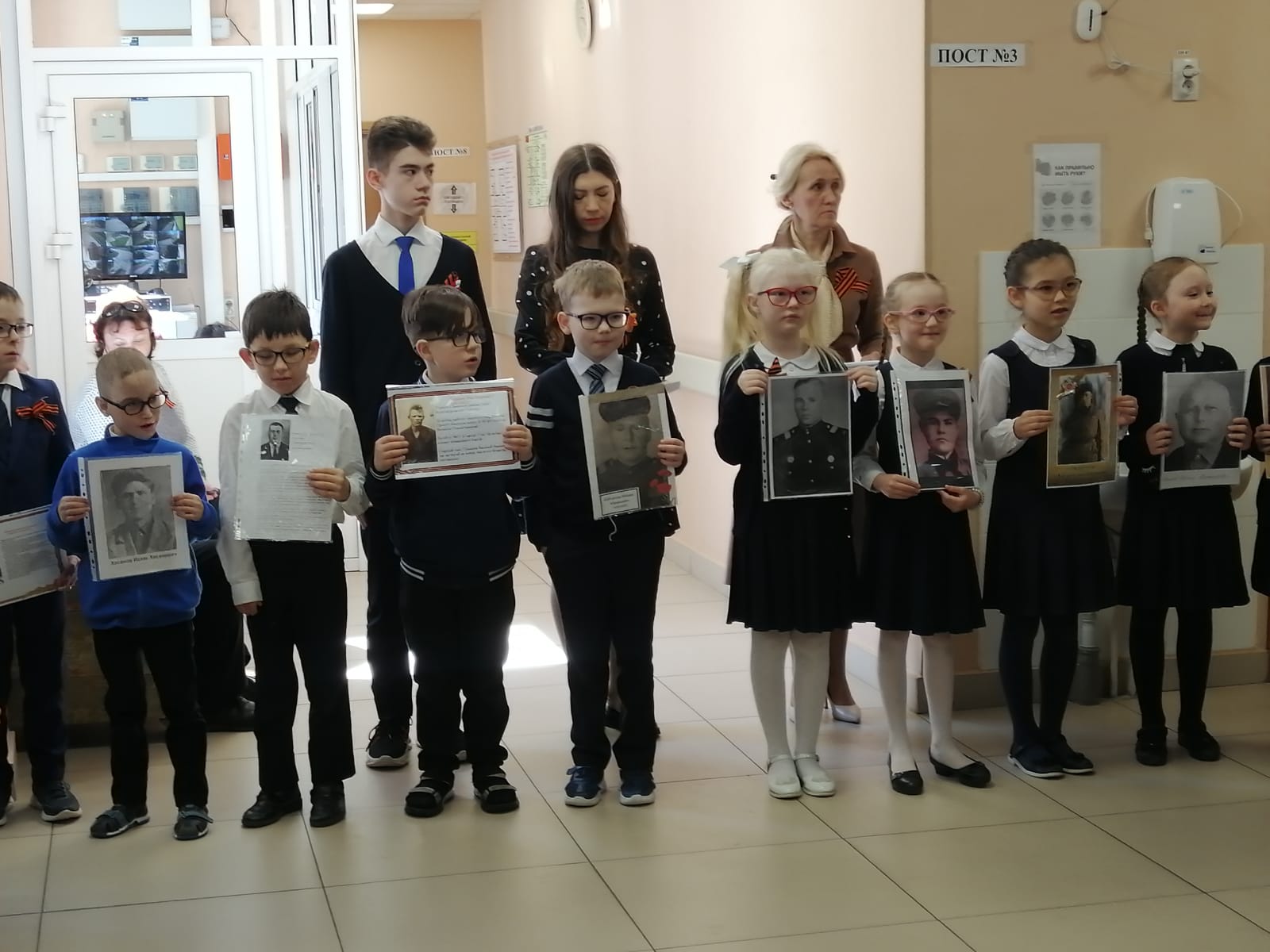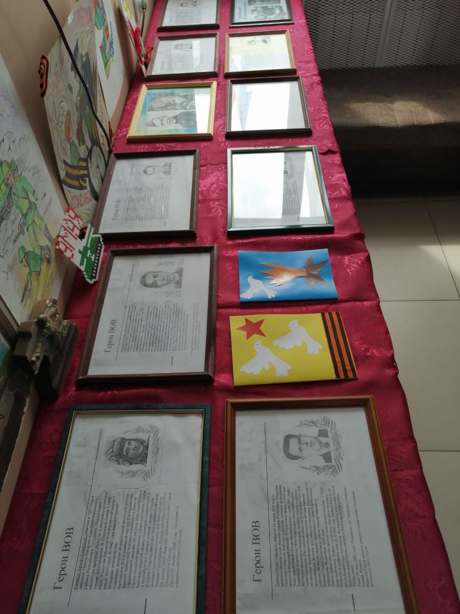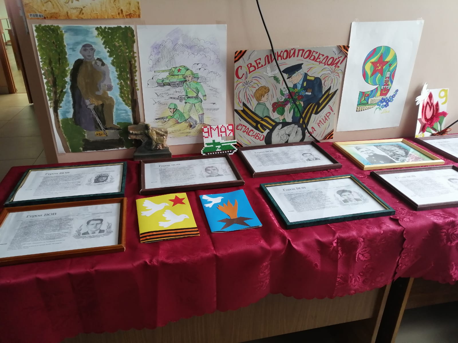 Учащиеся и коллектив школы в преддверии праздника Великой Победы приняли участие в акциях "Окна Победы", "Звезда Героя". Руководитель школьного музея Кокурина О. Н. оформила экспозицию "И помнит мир спасенный..."