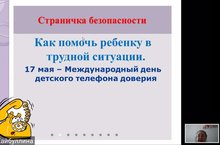 15 мая с учащимися начальных классов была проведена беседа в форме видеоконференции на тему: «Как помочь ребенку в трудной ситуации. Страничка безопасности». Была показана презентация, в которой говорилось о том, как быть ребенку, если ему не с кем поделиться своей проблемой. Детям рассказали, что существует телефон доверия, по которому можно позвонить и поделиться своими переживаниями, получить нужную информацию. Презентация сопровождалась доступными комментариями и объяснениями. Учащиеся слушали очень внимательно, были заинтересованы, вступали в диалог. В конце задавались вопросы по полученной информации.