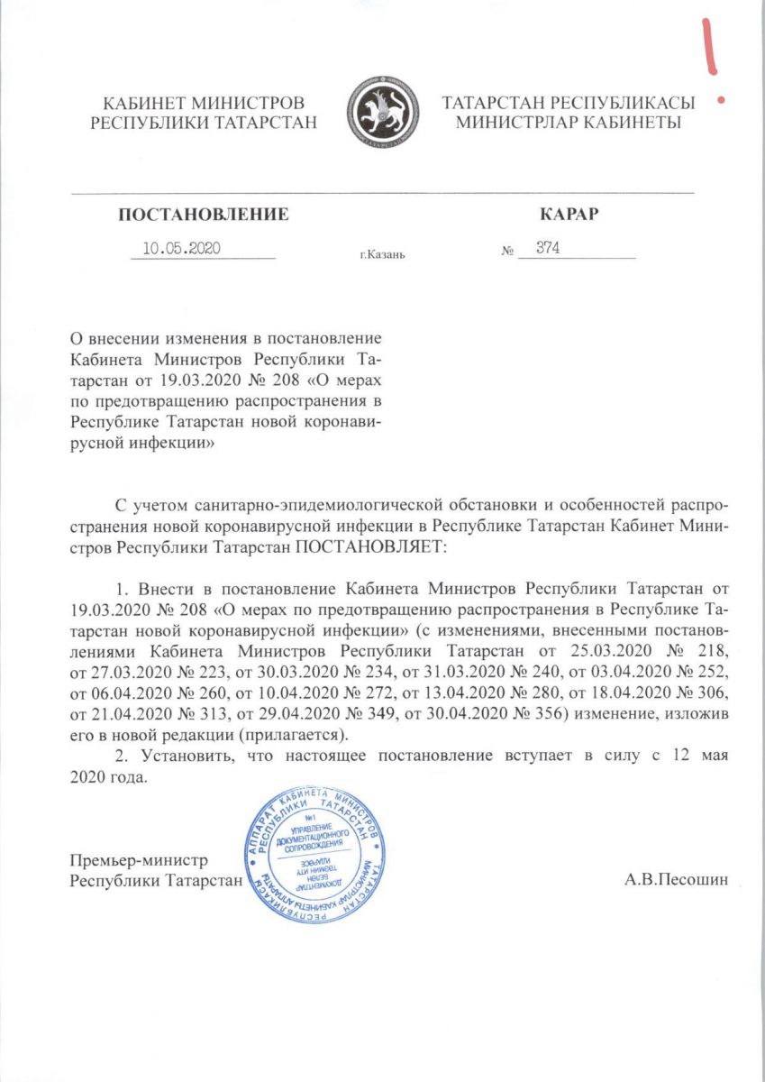 - О внесении изменения в постановление Кабинета Министров РТ от 19.03.2020 № 208 "О мерах по предотвращению распространения в Республике Татарстан новой коронавирусной инфекции" 12.06.2020