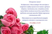 Поздравляем с Днем матери! От всей души и искреннего сердца желаем всем мамам: крепкого здоровья, счастливых глаз, спокойных ночей, пусть будет счастьем полон дом, пусть беды и проблемы исчезнут навсегда, будут непременно счастливыми года!