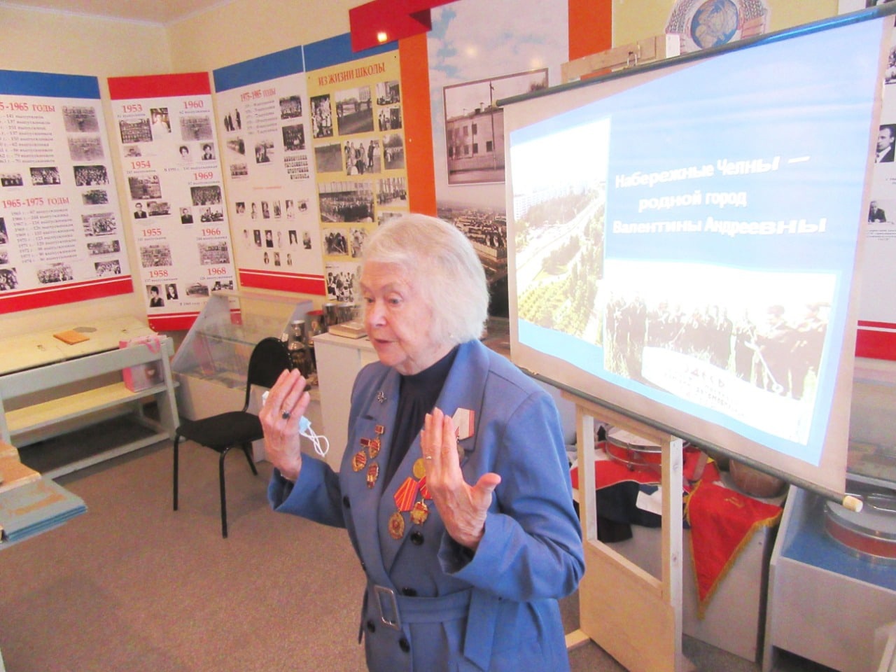 Опубликовано: 20.10.2021В рамках просветительской работы в Музее истории школы была организована встреча с Ветераном труда, выпускницей нашей школы 1954-1955 учебного года Забродиной Валентиной Андреевной. Гостья рассказала ученикам о своем жизненном пути. Ребята узнали много интересного о жизни города в годы строительства КАМАЗа.