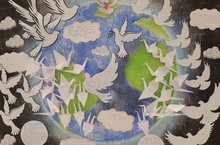 Плакат "Территория мира", в котором каждый пролицеист смог принять участие и написать сочинение на стикере на тему "Что для меня наш мир" или сделать журавлика, голубя.