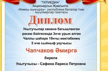 5 нче сыйныф укучысы Чапчаков Әмир Укытучылар көненә багышланган рәсем бәйгесендә катнашып 3 нче урын яулады.(Җитәкчесе- Сафина Л.П.) Бәйге бу елның 28.09 - 5.10 кадәр "Көмеш кыңгырау" республика балалар һәм яшүсмерләр газетасы тарафыннан оештырылды.