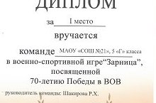 Поздравляем команду 5Г класса (руководитель Шакирова Р.Х.) ПОБЕДИТЕЛЯ в военно-спортивной игре "Зарница" 23.02.2015