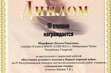 Поздравляем ученицу 10А класса Шарафиеву Назилю (научный руководитель Закиева Т.Н.) призера IV Республиканского конкурса научно-исследовательских работ учащихся «Аксаковские чтения»! 22.12.2014