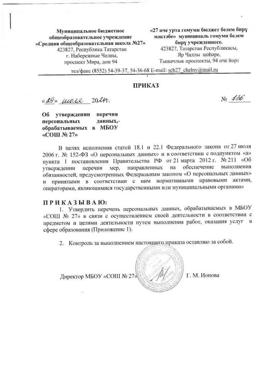 Приказ об утверждении перечня персональных данных, обрабатываемых В МБОУ "СОШ 27"