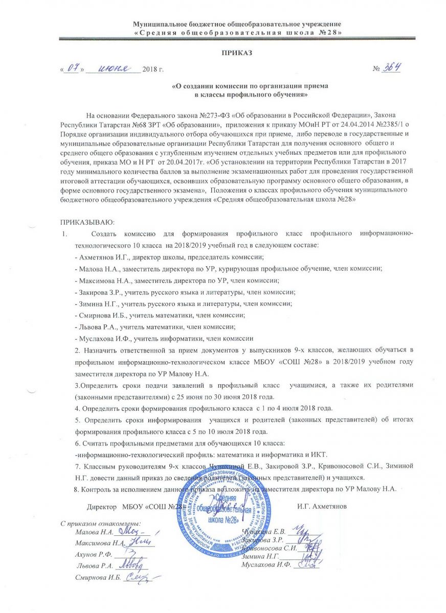 Приказ "О создании комисиии по организации приема в классы профильного обучения"