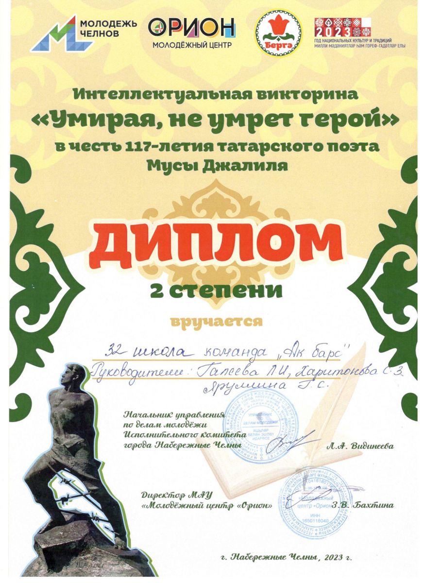 9 февраля 2023 года в МЦ «Орион» состоялась интеллектуальная викторина «Умирая, не умрёт герой»,в честь 117-летия татарского поэта Мусы Джалиля. Учащиеся 9В класса приняли участие и были награждены дипломом 2степени. Поздравляем! Молодцы!