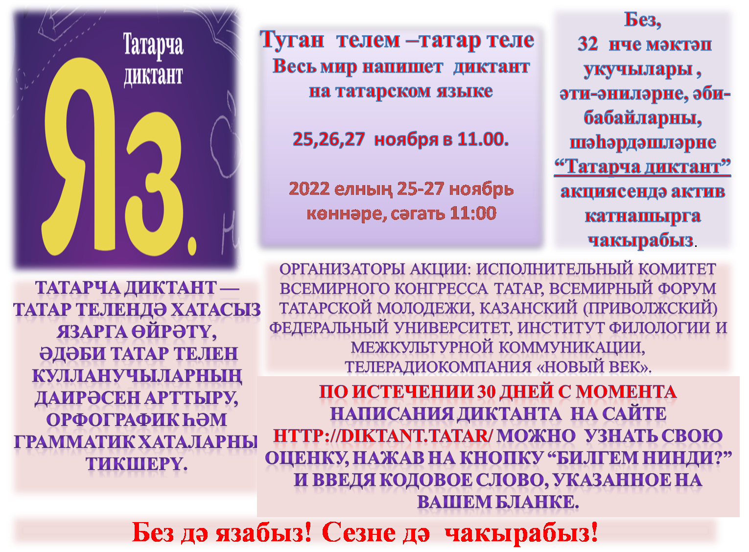 2022 елның 25-27нче ноябрь көннәрендә мәктәптә "Татарча диктант" татар теленнән дөньякүләм белем тикшерү акциясе уза. "Татарча диктант" акциясе мөстәкыйль рәвештә татар телен өйрәнүгә, дөрес язу күнекмәләрен үстерүгә юнәлдерелгән. Акциядә һәр кеше катнаша кала. Ел саен диктант язуда безнең мәктәп укучылары, ата-аналар, укытучылары актив катнаша. Быел Татарстан Республикасыннан катнашучылар татар язучысы, драматург, автор-башкаручы Зөлфәт Хәким әсәреннән өзек язачаклар. Бүген акциянең беренче көне булуга карамастан, инде 300дән артык укучы һәм ата-ана диктант язуда катнашты.