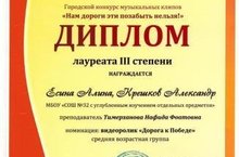 Поздравляем Есину Алину, Крешкова Александра, учителя Тимерханову Н.Ф. с победой в городском конкурсе музыкальных клипов "Нам дороги эти позабыть нельзя". Так держать!