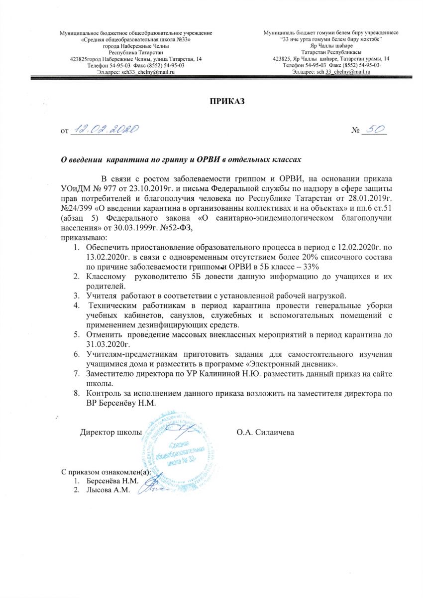 Уважаемые родители! В связи с ростом заболеваемости гриппом и ОРВИ, на основании приказа УОиДМ № 977 от 23.10.2019г. и письма Федеральной службы по надзору в сфере защиты прав потребителей и благополучия человека по Республике Татарстан от 28.01.2019г. №24/399 «О введении карантина в организованны коллективах и на объектах» и пп.6 ст.51 (абзац 5) Федерального закона «О санитарно-эпидемиологическом благополучии населения» от 30.03.1999г. №52-ФЗ, приостановливается образовательный процесс в период с 12.02.2020г. по 13.02.2020г. в связи с одновременным отсутствием более 20% списочного состава по причине заболеваемости гриппом и ОРВИ в 5Б классе - 33%