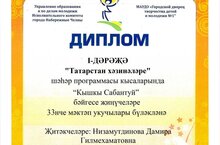 Учащиеся нашей школы успешно занимаются по городской программе "Сокровища Татарстана". Дети 5а класса приняли участие в конкурсах "Зимний сабантуй", "21 век - век науки и высоких технологий, "Я - режиссер" и заняли призовые места. Спасибо учителю Дамире Гилмехаматовне за подготовку детей на такие мероприятия! Поздравляем!!!