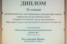 Поздравляем ученицу 3 Б класса Колупаеву Ирину с призовым местом в республиканском конкурсе-фестивале творчества на английском языке " English Art Festival" в номинации "Исполнение вокального произведения группа "В" и руководителя учителя английского языка Гизатуллину Г.Ф.