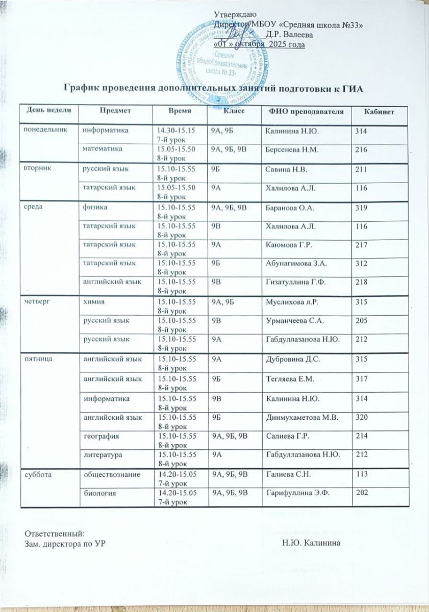 Ответственный за организацию подготовки и проведение ГИА 9-х классов: заместитель директора по УВР Калинина Н.Ю., т. 8-903-319-48-44