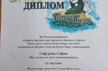 Поздравляем Гафурову Сафию с победой в номинации "Самая талантливая" муниципального конкурса "Татар кызы-2024" классный руководитель Акмаллова Г.А. В финал прошли девять девочек из разных школ нашего города, прошедших отборочный тур, демонстрировали уровень общения на татарском языке, участвовали в дефиле в татарских костюмах, показывали визитную карточку, демонстрировали свои таланты в творческих номерах, рассказывали о своей семье в семейном конкурсе. Конкурсные испытания завершились финальным дефиле. В жюри конкурса были выдающиеся деятели в области национального татарского искусства, преподаватели по вокалу, театральному мастерству, редактор журнала "Майдан"..Все участницы конкурса получили дипломы, цветы и памятные подарки.