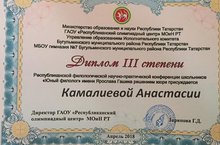 25.04.2018 года в городе Бугульма прошла научно-практическая конференция «Юный филолог» имени Ярослава Гашека. Ученица 7в класса Камалиева Анастасия приняла участие в данной конференции с произведением собственного сочинения. Жюри высоко оценило работу нашей учащейся и присудило ей 3-е место.