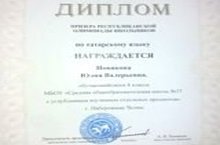 С 02 по 04 февраля 2018 года на базе ГАОУ «Республиканский олимпиадный центр» Министерства образования и науки Республики Татарстан прошел заключительный этап республиканской олимпиады школьников по татаркому языку, в котором приняла участие учащаяся 9 "А" класс и стала призером.