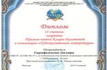 17 марта 2017 года в ГАОУ ВО "Альметьевский государтсвенный институт муниципальной службы" состоялся подведение итогов конкурса по присуждению Премии имени Клары Булатовой. Ученица 10А класса Гарифьянова Диляра была награждена дипломом II степени. Благодарим Диляру и учителя татарского языка и литературы Назмутдинову Э.М.