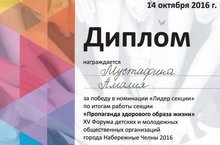 Мустафину Амалию, ученицу 9б класса за победу в номинации 2Лидер секции" по итогам работы секции "пропаганда здорового образа жизни" XV форума детских и молодежных общественных организаций города Набережные Челны