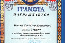 учителя технологии Шагеева Гапдрауфа Шайхиевича, занявшего I места в городской научно-технической выставке "Рационализатор-2016" в рамках программы "Дети. Техника. Творчество".